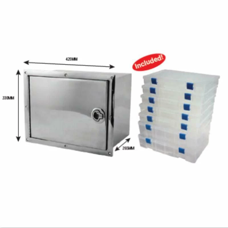 The Viper flush mount marine grade 316 stainless steel tackle/storage locker is 100% seam welded, linished and hand polished to a mirror finish and is ideal for storing your tackle such as lures, sinkers, hooks, knives, etc keeping your deck free of any hazards.
