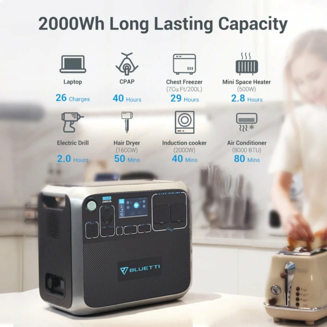 BLUETTI AC200PÂ portable power station has a large battery capacity of 2000Wh. It could power most home appliances and heavy-duty DIY tools under 2000W (4800W Surge).
