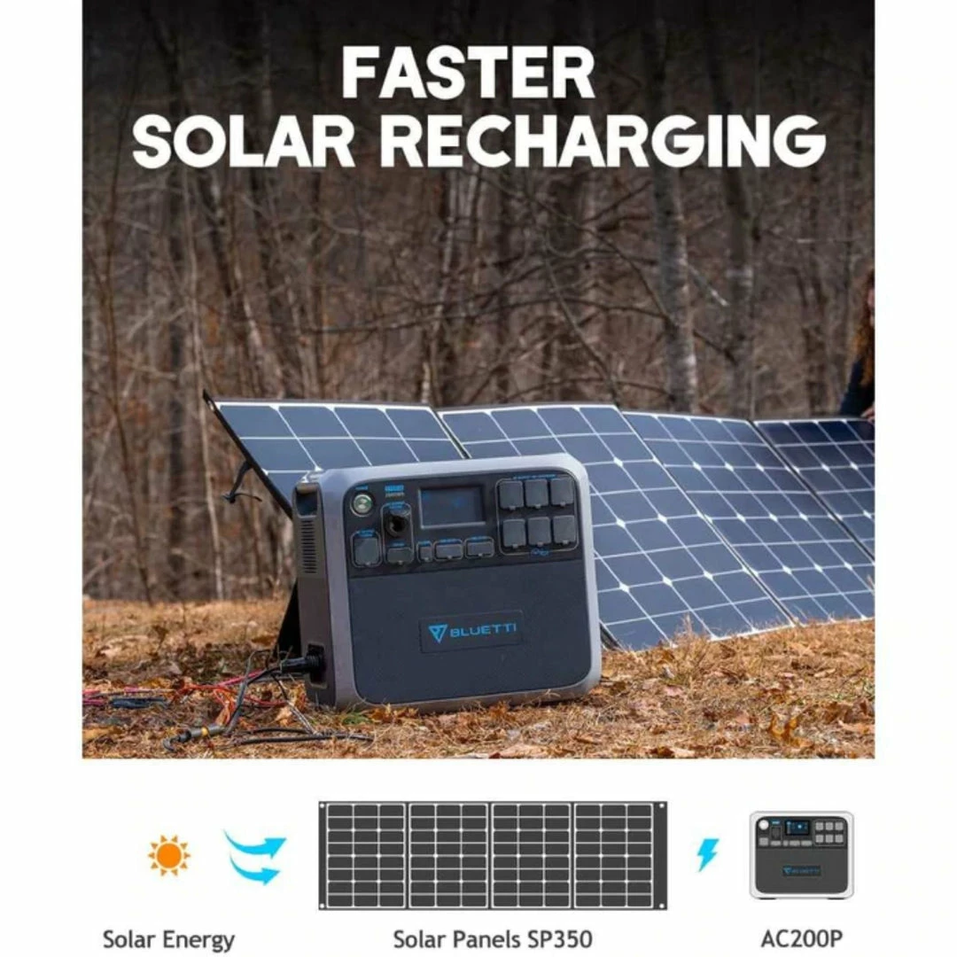 A single BLUETTI SP350 350W solar panel can charge these models, and it takes 4 hours to recharge an AC200P/AC200MAX/EB200P through 2pcs SP350 350W solar panels. With the high 350w output, which enables the recharging speed faster than other small solar panels.