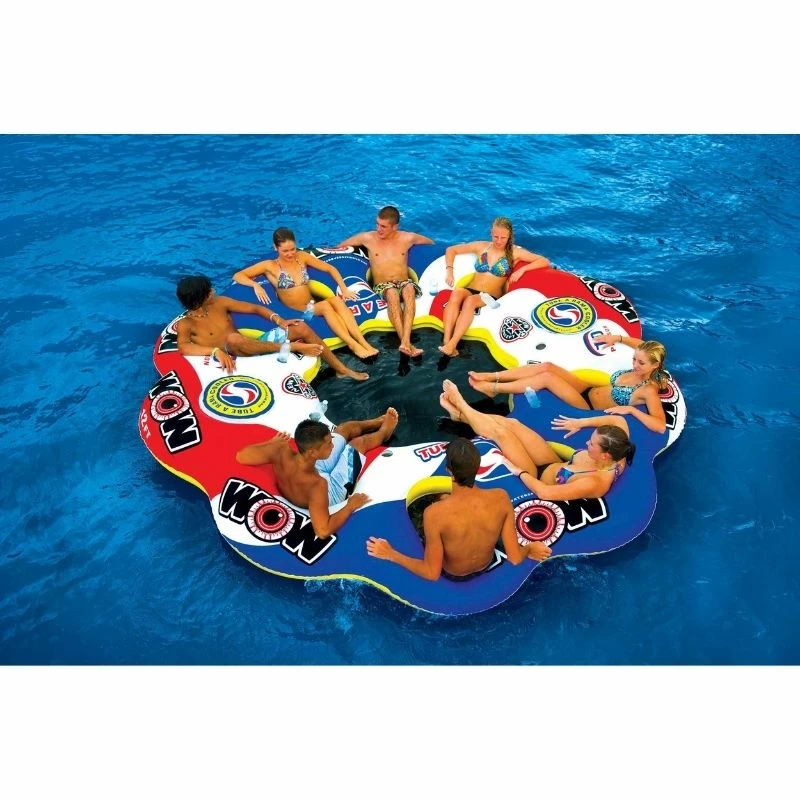 Itβs party time with the HUGE inflatable party island. This huge 12ft. diameter inflatable island is great for parties at the lake or as a river float tube. Room for up to 10 people, this inflatable water toy was designed with 8 tubes around the diameter, 4 with mesh and 4 without for added play value. There is also a large mesh central deck for relaxing in as well. And for added convenience we have designed 2 Large BUILT-IN coolers for keeping your favorite beverages cold on a hot day. The island also comes with 8 recessed cup holders. Fun for the kids and adults, the colorful graphic design will be sure to draw attention and get your party started. Made from 100% Heavy-Duty PVC material.