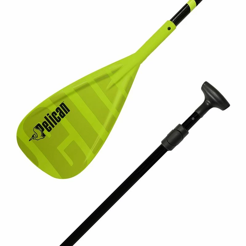 The VATE stand up paddle board paddle is light and offers durability and performance. Its fiberglass wrapped two-piece aluminum shaft with pin locking mechanism allows for rapid length adjustment and a more comfortable grip. Its T-grip handle offers maximum control for greater efficiency.