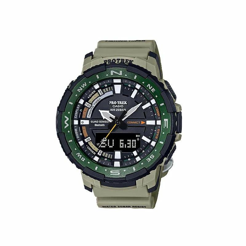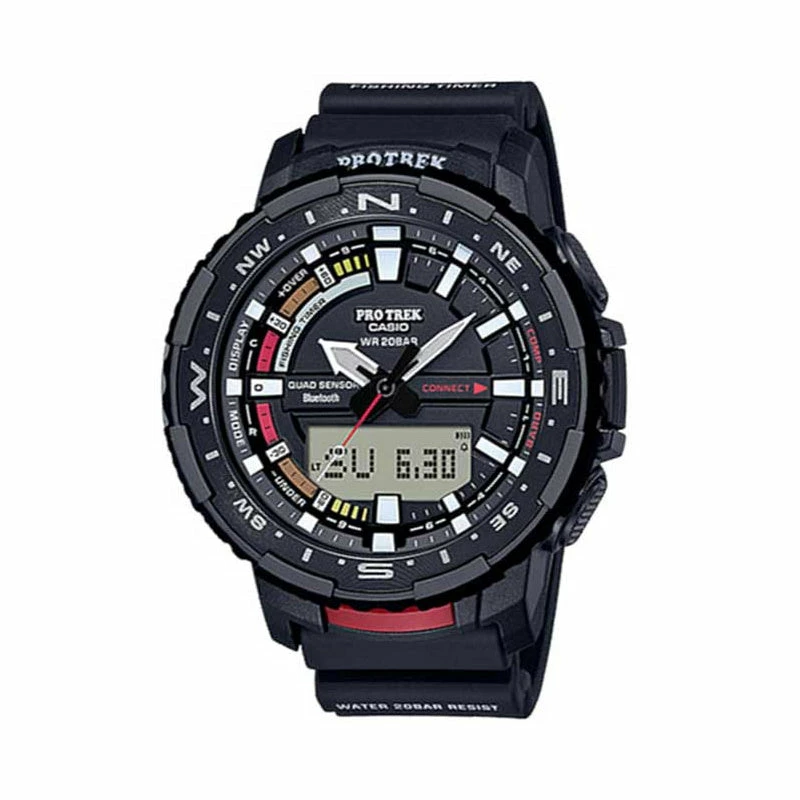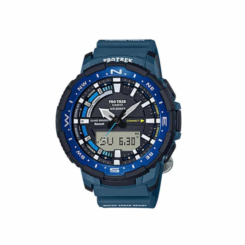 Introducing the 200-meter water-resistant PRO TREK PRT-B70. Bluetooth® lets you link with the PRO TREK Connected app on your phone to access features and functions specially designed for fishing.