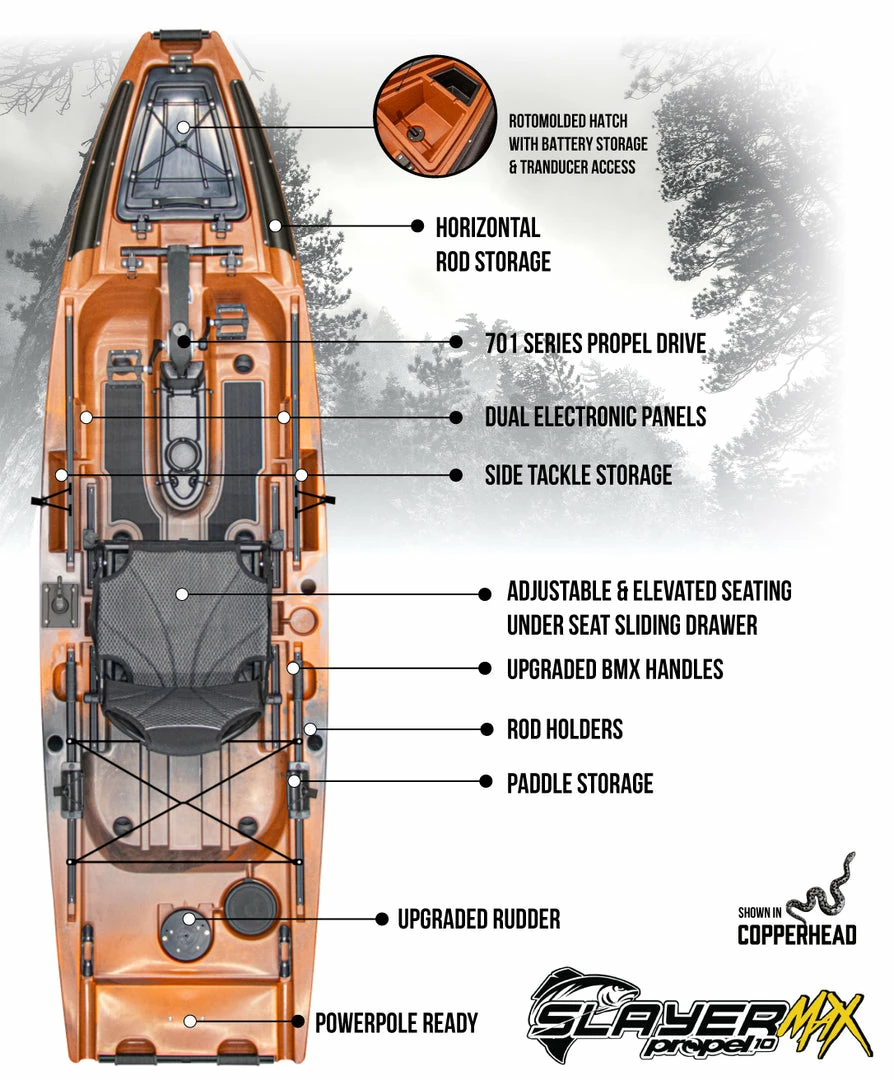 Powered by Native Watercraft’s unique Propel Pedal Drive System which boasts forward and reverse, the Slayer Propel 10 keeps you on the fish and provides a major aid landing the catch of the day.