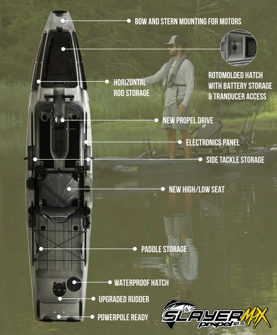 The hands-free forward to reverse propel pedal drive. Couple all these new features with the updated extended rudder and you have one serious kayak fishing platform that will perform in offshore salt, inshore salt and in freshwater environments. The new slayer propel max 12.5 will undoubtedly become the boat of choice for a wide variety of kayak anglers.