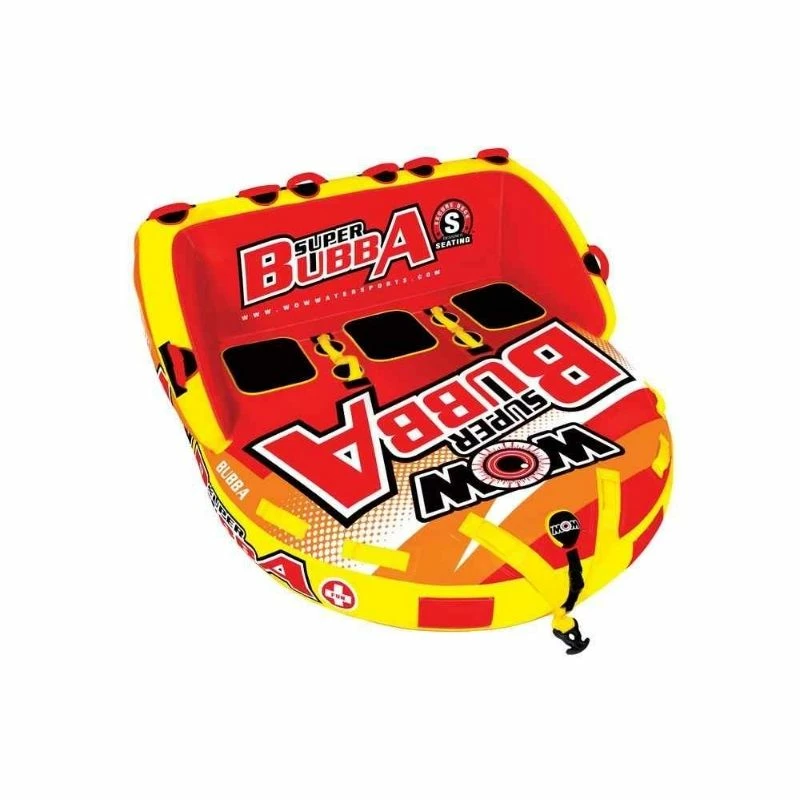 2 way towing, ride sitting, kneeling, or in the prone position. Bold graphics and a recumbent back rest with sidewalls to keep you in place makes this towable tube an easy ride. The Super Bubba is a 3 person towable tube that slips across the boat wake and travels fast in the whips. A real screamer of an inflatable towable that can be ridden by 1-3 people. The Super Bubba is an all-time favorite for water ski tube enthusiasts.
